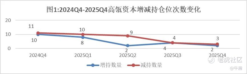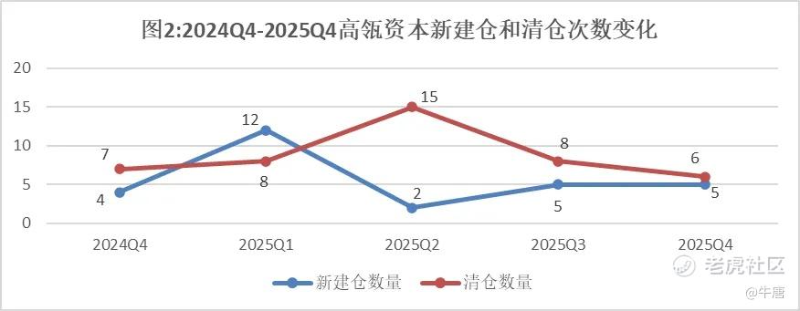 2024年四季度至2025年四季度,高瓴资本累计新建仓位次数(28)大幅低于累计清仓仓位次数(44),逐季来看,仅在2025年一季度,新建仓次数超过了清仓次数。