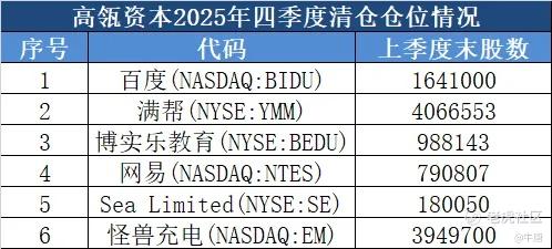 百度、满帮、Sea都是高瓴资本在2025年三季度的新建仓位,但却在四季度被清仓。