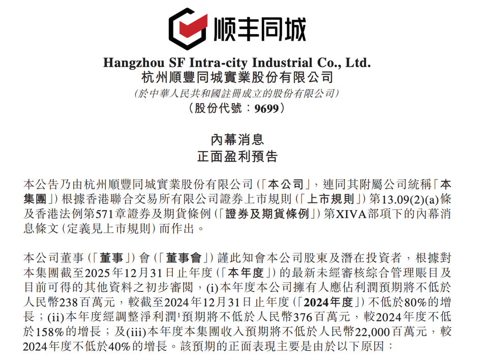 身处这一关键时点,顺丰同城再次交出高分答卷:继2023年率先行业扭亏为盈成为“即时物流盈利第一股”后,近期发布正面盈利预告,预期2025年经调整净利同比增长不低于158%,全年收入同比增长不低于40%,连续六个周期实现盈利,且盈利持续翻倍,领跑即配行业。