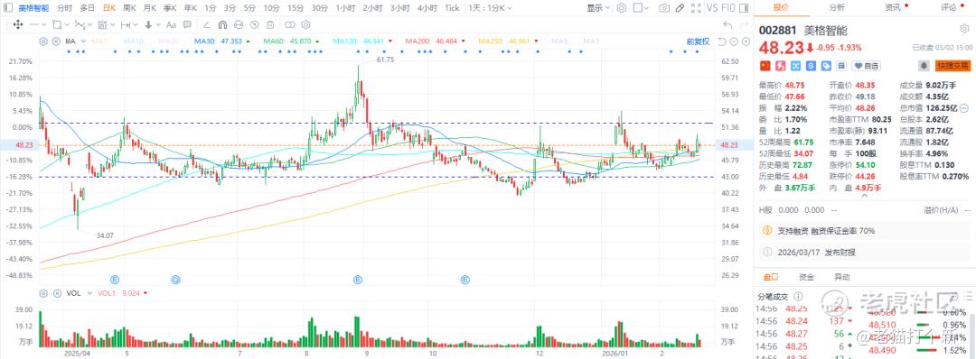 美格智能倒同样常年就是在43~52之间震荡,就是趋势走的还不错。