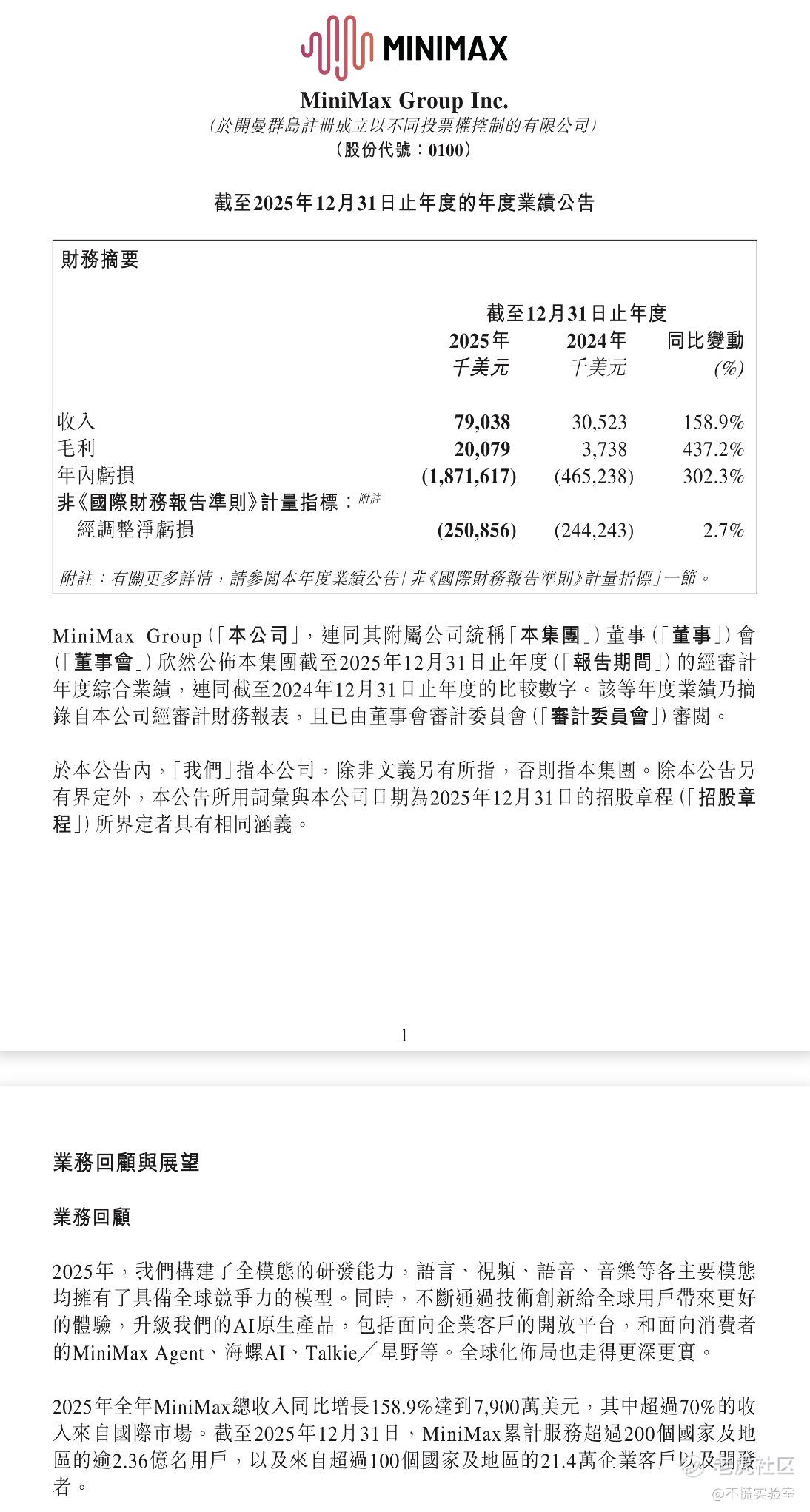 MiniMax全年实现总收入7903.8万美元,同比大涨158.95%;毛利大幅增长437.16%至2007.9万美元,毛利率从12.25%提升至25.40%,经营效率持续改善。