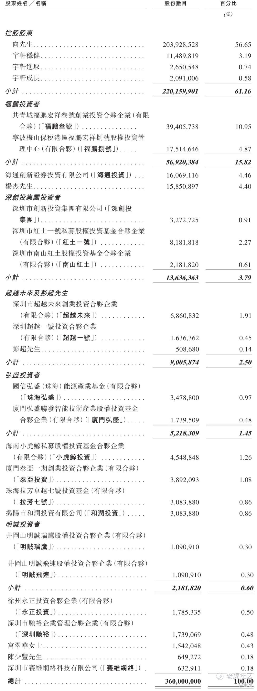 福鹏叁号持股为10.95%,福鹏捌号持股为4.87%,一共持股为15.82%;海通投资持股为4.46%,杨杰持股为4.4%;深创投持股为0.91%,红土一号持股为2.27%,南山红土持股为0.61%,一共持股为3.79%;