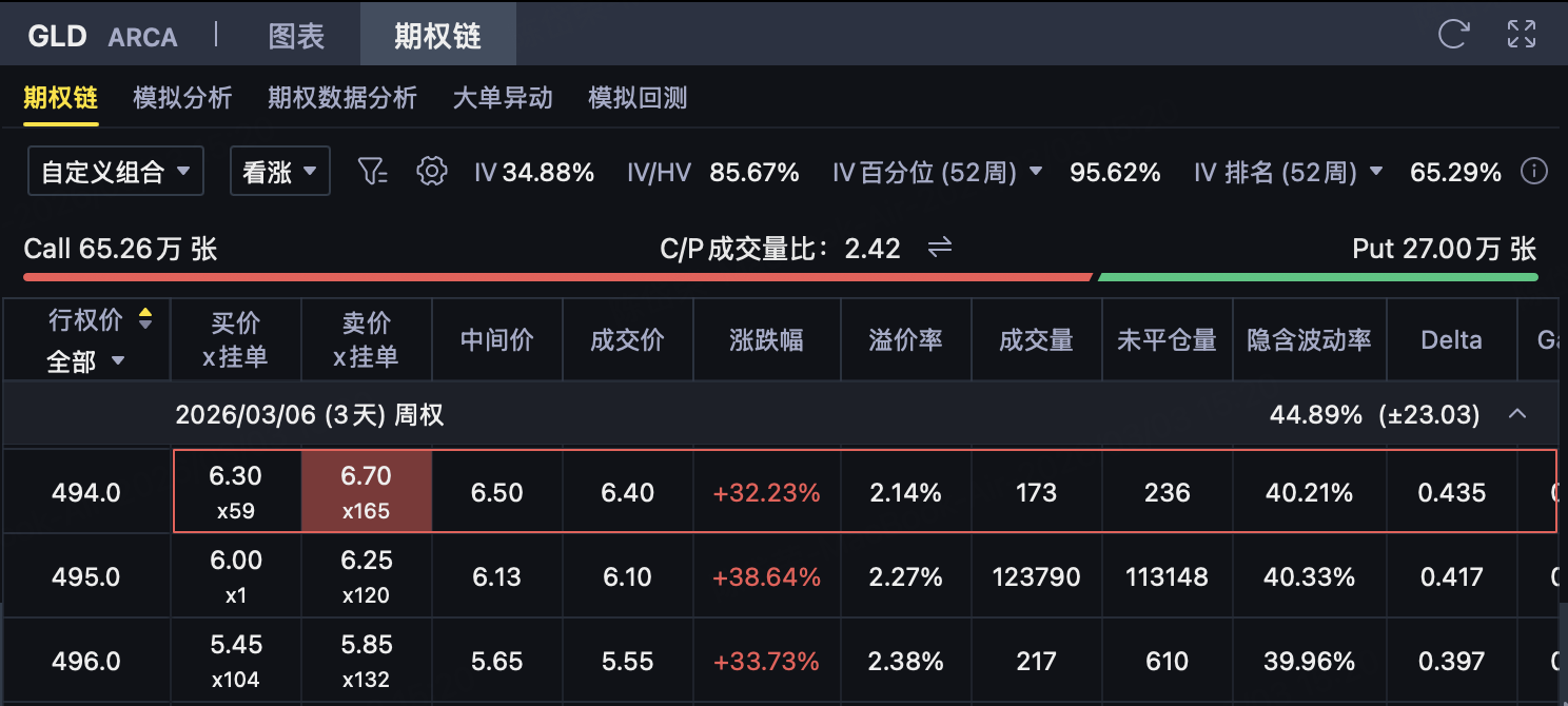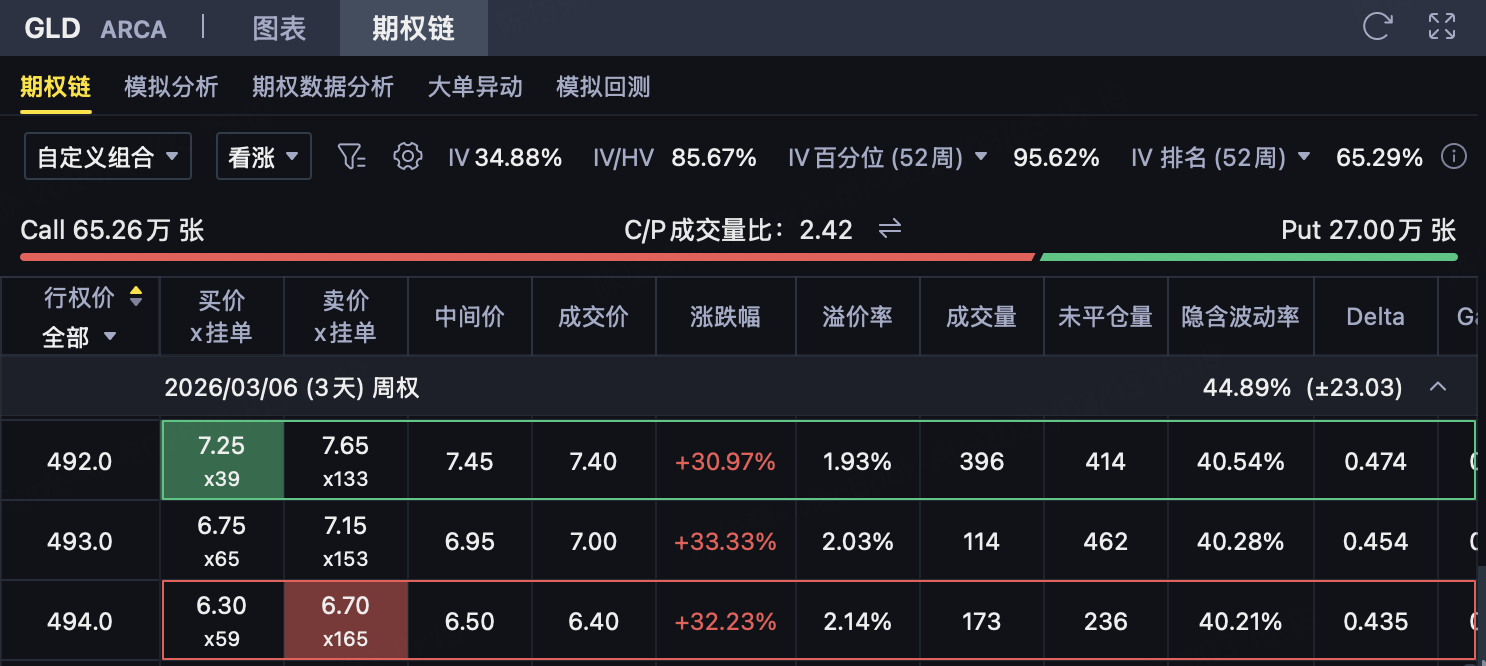 因此,在判断黄金或贵金属短线难以显著突破上方关键阻力并可能在高位震荡回落的情形下,构建熊市看涨价差(Bear Call Spread)策略(比如用 GLD 近月执行价 492 / 494 的看涨价差结构)可以: