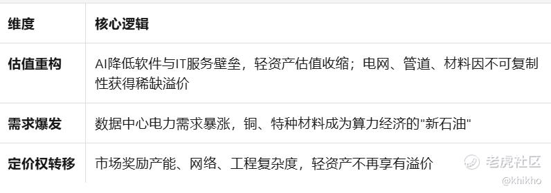 这一转变的底层逻辑极具讽刺意味, AI技术越是先进,那些AI抢不走, 且为AI所依赖的重资产就变得越有价值。正如高盛在2026年2月发布的报告 “HALO影响力 AI领域的重资产、低淘汰” 中所指出的,市场正在奖励产能、网络、基础设施与工程复杂度,轻资产不再享有溢价。这不仅是简单的板块轮动,而是资产定价逻辑的系统性重构,从追求 可快速扩张的轻资产叙事"转向可落地建造, 难以被替代的实体产能与网络.