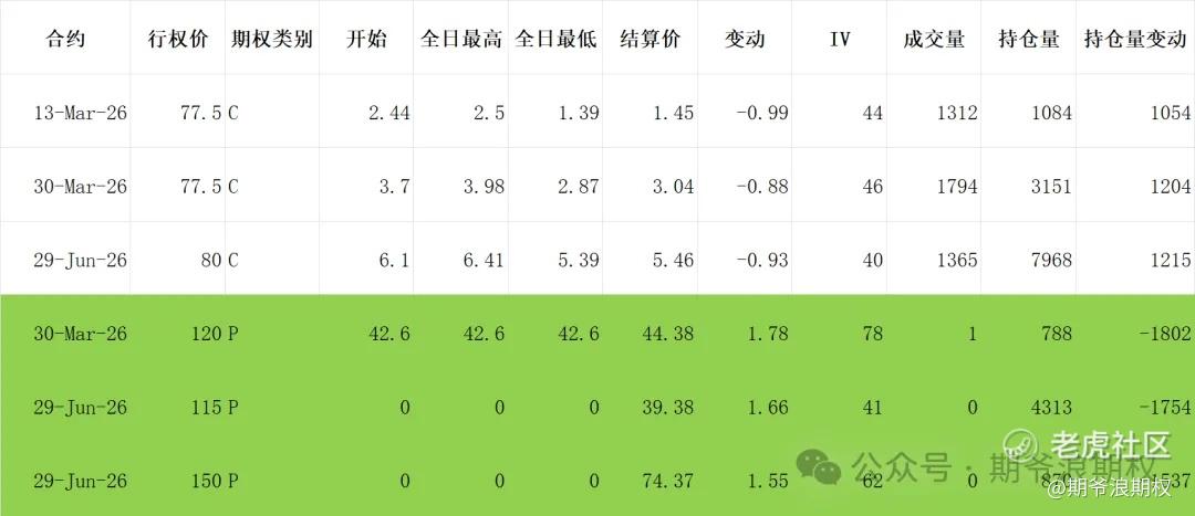 (3)美团:3月最大持仓范围85-110,窝轮牛熊街货分布70-90,今收75.65,下跌2.26%。期权盘路变化超过1000张的仓位如下,浅绿色是深度实值减仓,继续有大佬撤资。