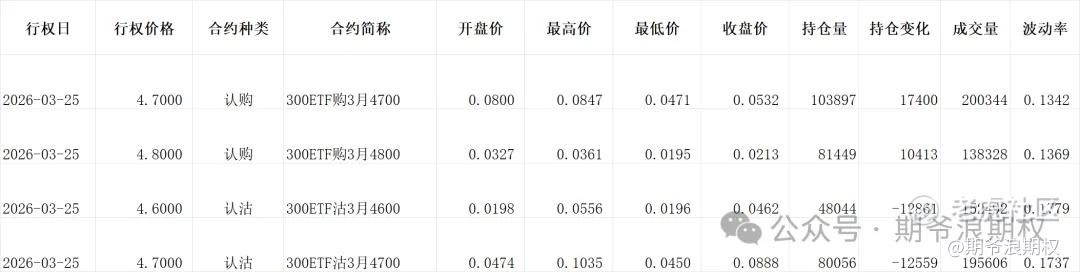 (1)沪深300ETF(沪)期权:3月最大持仓范围4700-4700,今收4.678,下跌1.29%。期权3月主力合约,认购以增仓为主,集中在4678-4800,合计3.5W张,其他行权价大多是减仓,但量不大;认沽以减仓为主,集中在4500-4800,合计3.5W张。变化超过1W张的仓位如下,多空仍然在4700有分歧,偏悲观。