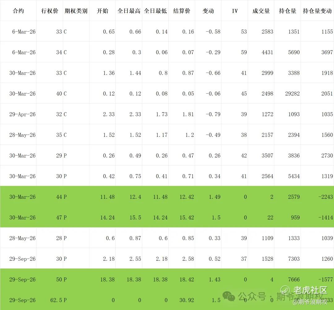 (5)小米:3月最大持仓范围35-40,窝轮牛熊街货分布30-40,今收31.58,下跌4.71%。期权盘路变化超过1000张的仓位如下,浅绿色是深度实值减仓,也就是说,有大佬原计划要买入小米股票,今天撤资了。