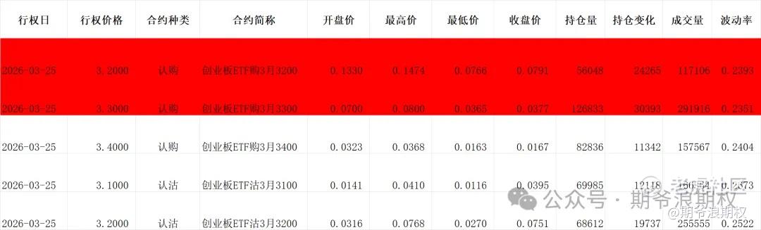 (3)创业板ETF期权:3月最大持仓范围3300-3300,今收3.205,下跌2.35%。期权3月合约,认购以增仓为主,集中在3100-3500,合计8.7W张;认沽全部都是增仓,仍然集中在两个区域,一个是2100-2450,合计2.4W张,另一个是2650-3300,合计6.2W张。变化超过1W张的仓位如下,红色是增仓较大的。多空仍然在3300的位置有分歧,市场偏悲观。