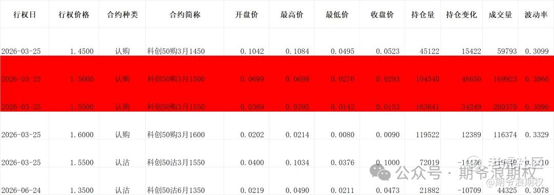 (2)科创50ETF:3月最大持仓范围1550-1550,今收1.464,下跌5.18%。期权3月主力合约,认购以增仓为主,集中在1400-1600,合计11.3W张,其他行权价大多是减仓,集中在1700-1800,合计1.4W张;认沽是低行权价增仓高行权价减仓,增仓集中在1250-1400,减仓集中在1500-1650,合计2.1W张。变化超过1W张的仓位如下,红色是增仓较大的,多空继续在1550有分歧,偏悲观。