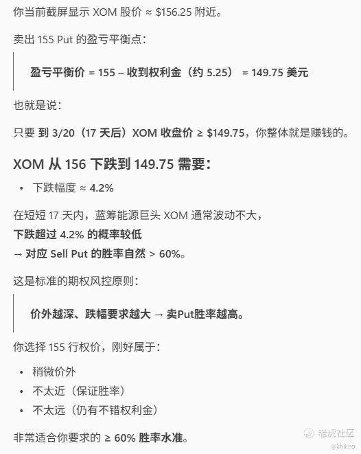 下一个问题,就是关于期权的了,我给了股票页面的截图,我问的是 “请根据 $埃克森美孚(XOM)$ 现在的股价,当前的期权链,推荐一个胜率至少达到60%的期权策略,单腿策略。”