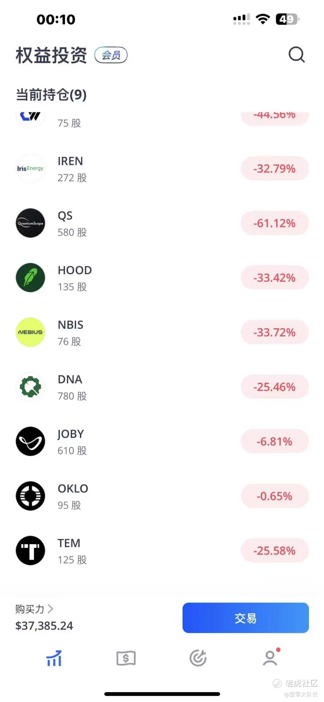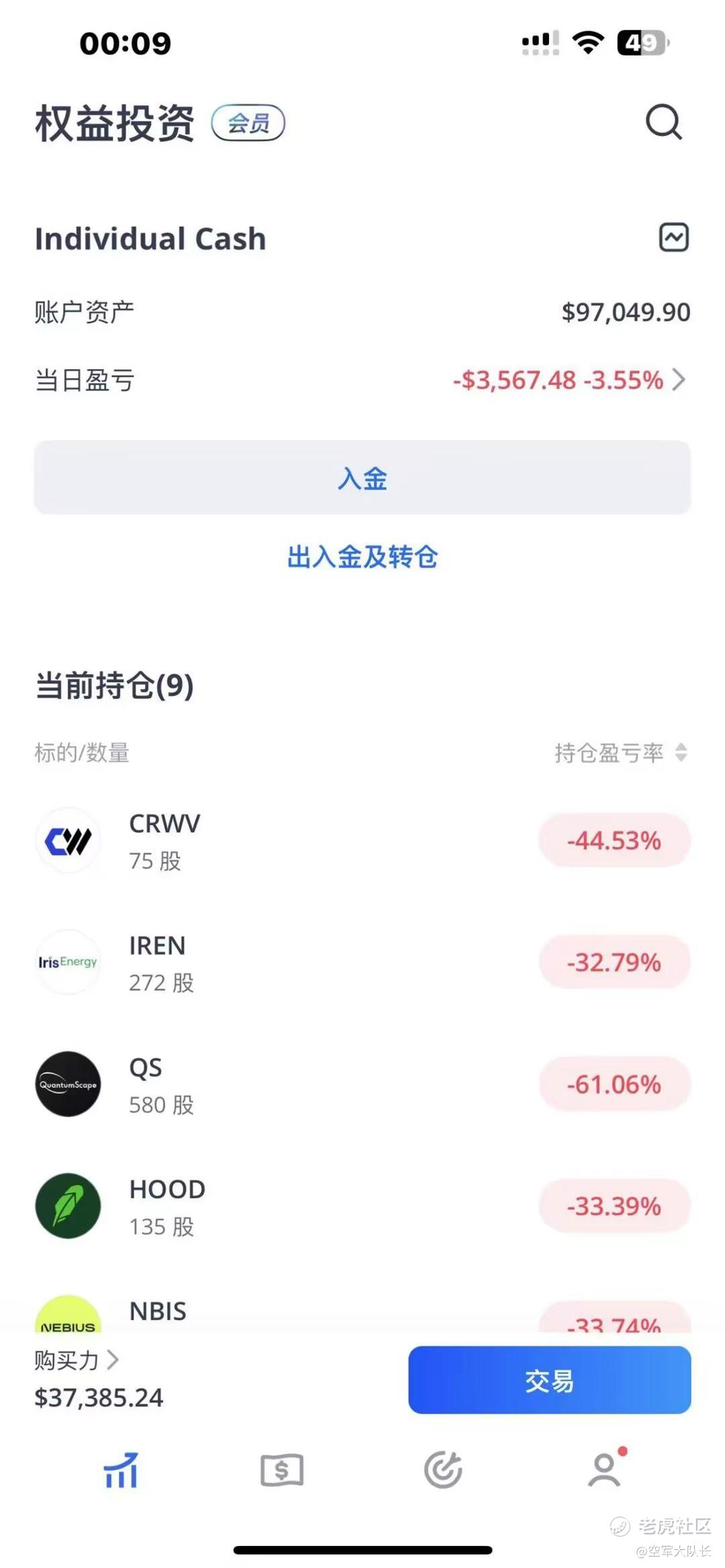 我的实盘账户现在只有9.7万美元,亏了3000美元,本来减仓是对的,因为又跌了,但是卖的是CRCL,结果一直涨,补仓的IREN跟HOOD又一直跌,打算后面哪个跌得多就补仓哪个。
