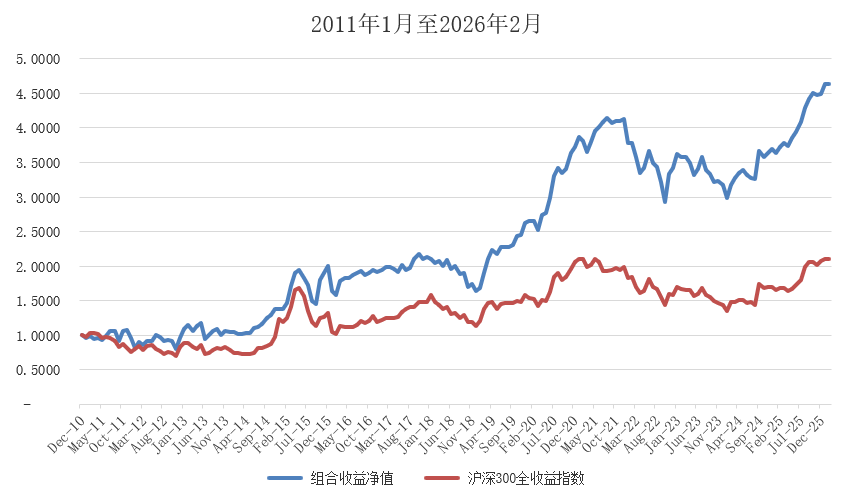 实际组合从2011年初至2026年2月份末净值是从1元至4.6280元。年化收益率是10.63%。
