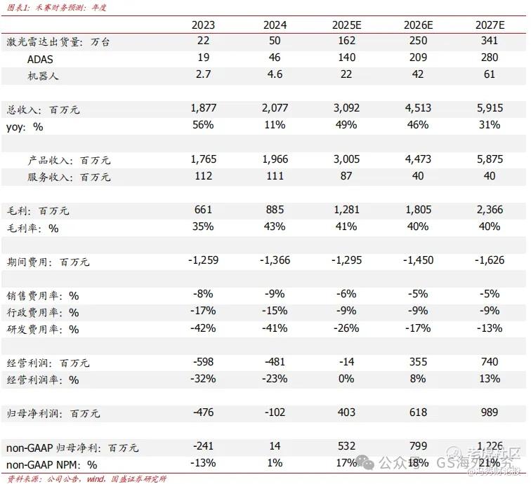 重申“买入”评级。我们预计禾赛2025-2027年激光雷达出货量约162/ 250/341万颗,收入约30.9/45.1/59.2亿元,GAAP归母净利约4.0/6.2/9.9亿元,non-GAAP归母净利约5.3/8.0/12.3亿元。我们给予禾赛(2525.HK)目标价266港币及(HSAI.O)目标价34美金,对应27x2027e P/E,重申“买入”评级。