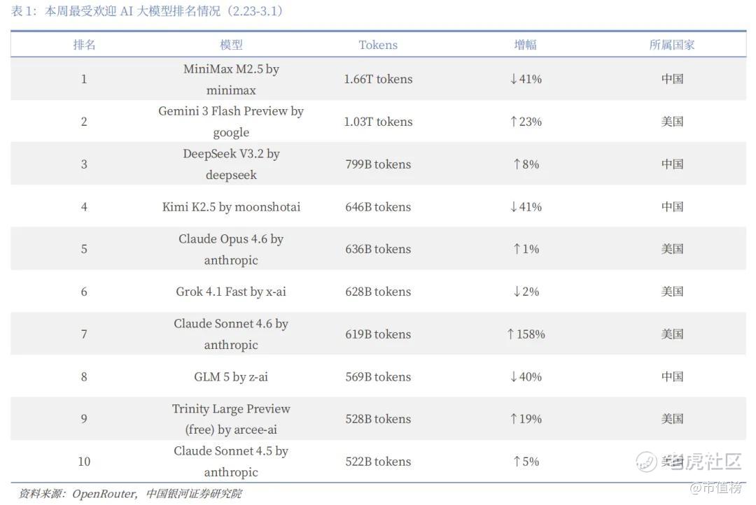 截至2026年2月28日,该平台内前十模型总Token消耗量已突破28.7万亿,其中,国产模型贡献超过14.69万亿,为历史上首次单月Token调用占比过半,且超越了美国模型。