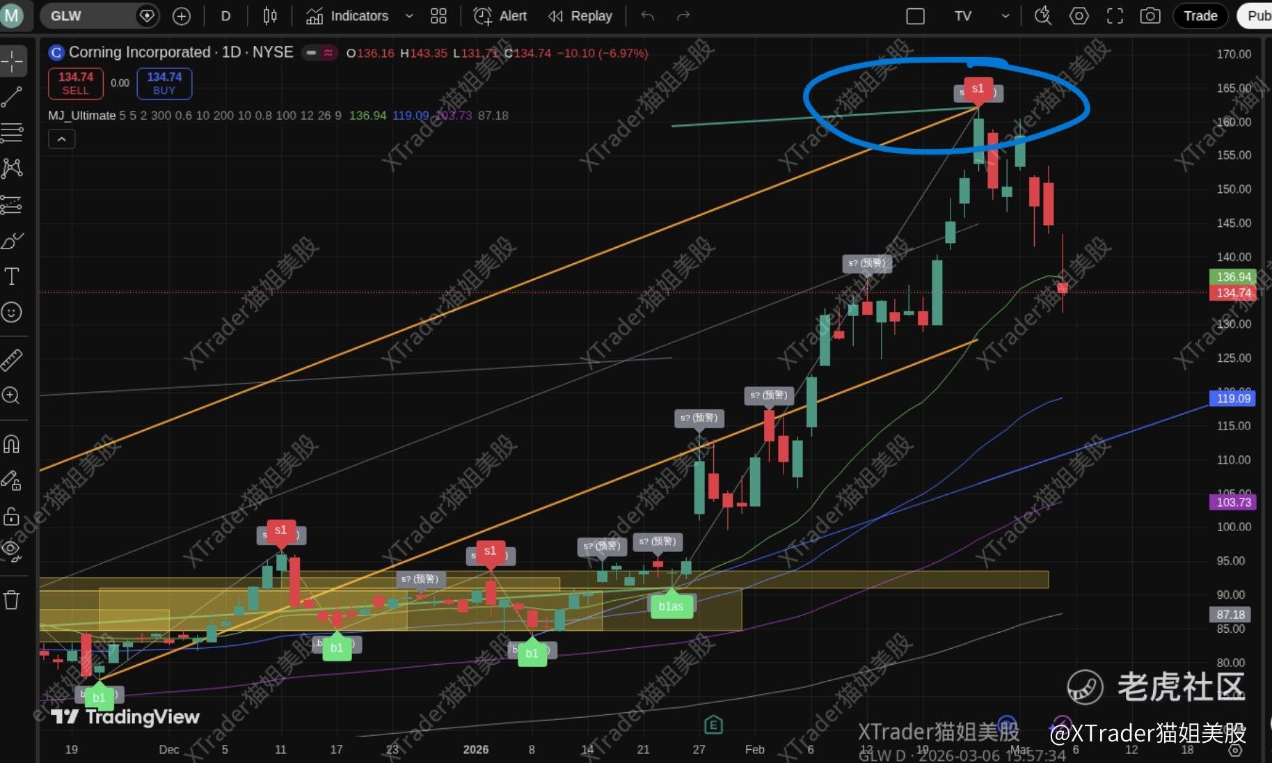 $GLW 我们禅动买卖点指标确认了2月25日卖点,如图,算上这轮买点在1月23日出预警,25日确认,差不多一个月,也符合目前市场轮动和分化的节奏。
