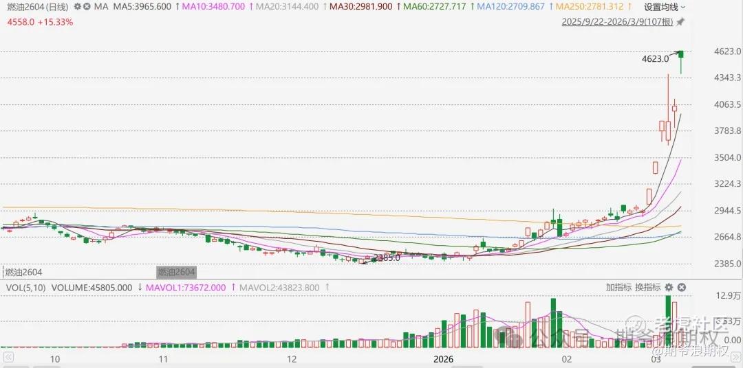 燃油2604合约从3000左右涨到4623,大涨54%。