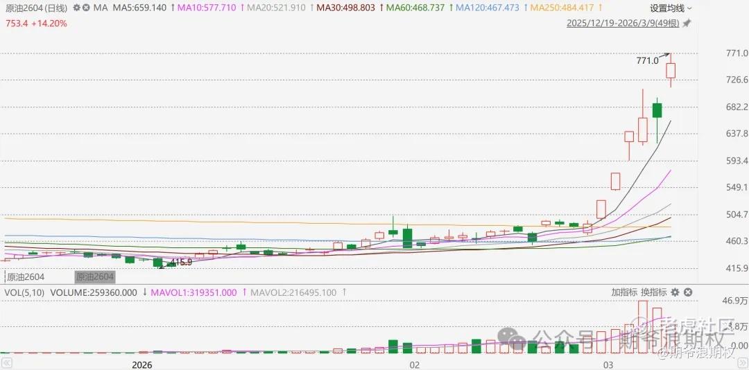 原油2604合约从500左右涨到771,大涨54%。