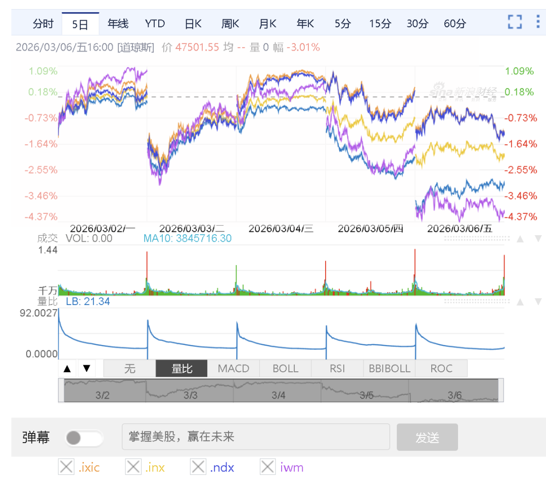 标普500指数盘中再次创下阶段新低逼近6700点关口,纳指和纳指100周度跌幅较温和,周期股较多的道指(图中蓝线)和罗素2000反而跌幅较大。
