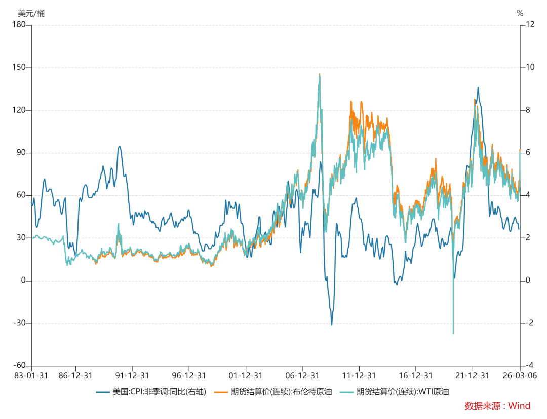 至于通胀的问题,历史来看这种供应扰动造成的消极影响短暂——海湾战争、两伊战争、伊拉克战争和俄乌战争对油价的脉冲影响都在几个礼拜内解决。除了2022年因为供应链和货币财政过度通胀外,其余的几次通胀都回落较快。另外,这几次战争造成的(技术性)经济衰退都短暂温和,没有过于严重的冲击。