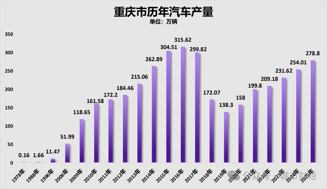 以此来看,2025年重庆虽然以278.8万辆产量重回第一,但与自身巅峰期相比,仍差了一些。