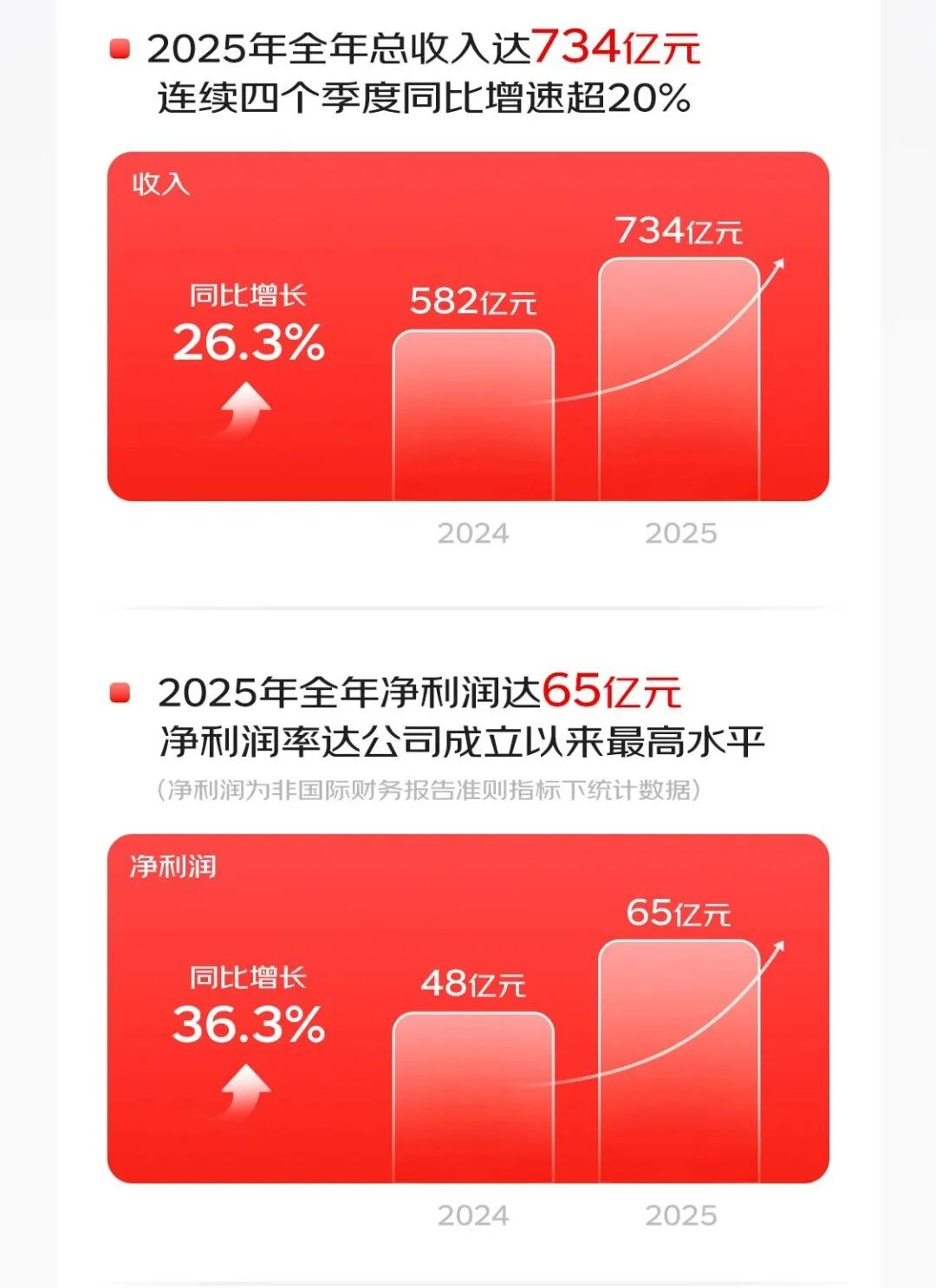 2025全年营收734亿元,同比增长26.3%。非国际财务报告准则指标下(Non-IFRS)净利润率达到8.9%,创成立以来最高水平。