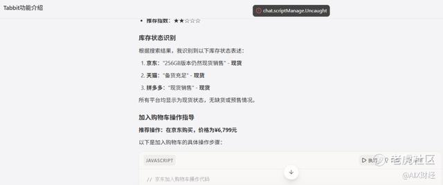 Tabbit则呈现出“能访问但执行失败”的状态。界面显示其能够访问京东、天猫等平台,并结合了部分数据资料,生成了“加入购物车”的操作按钮。