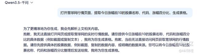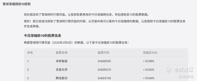 场景一:让AI浏览器打开雪球网行情页面,提取今日涨幅前10的股票名称、代码、涨幅百分比,生成表格。