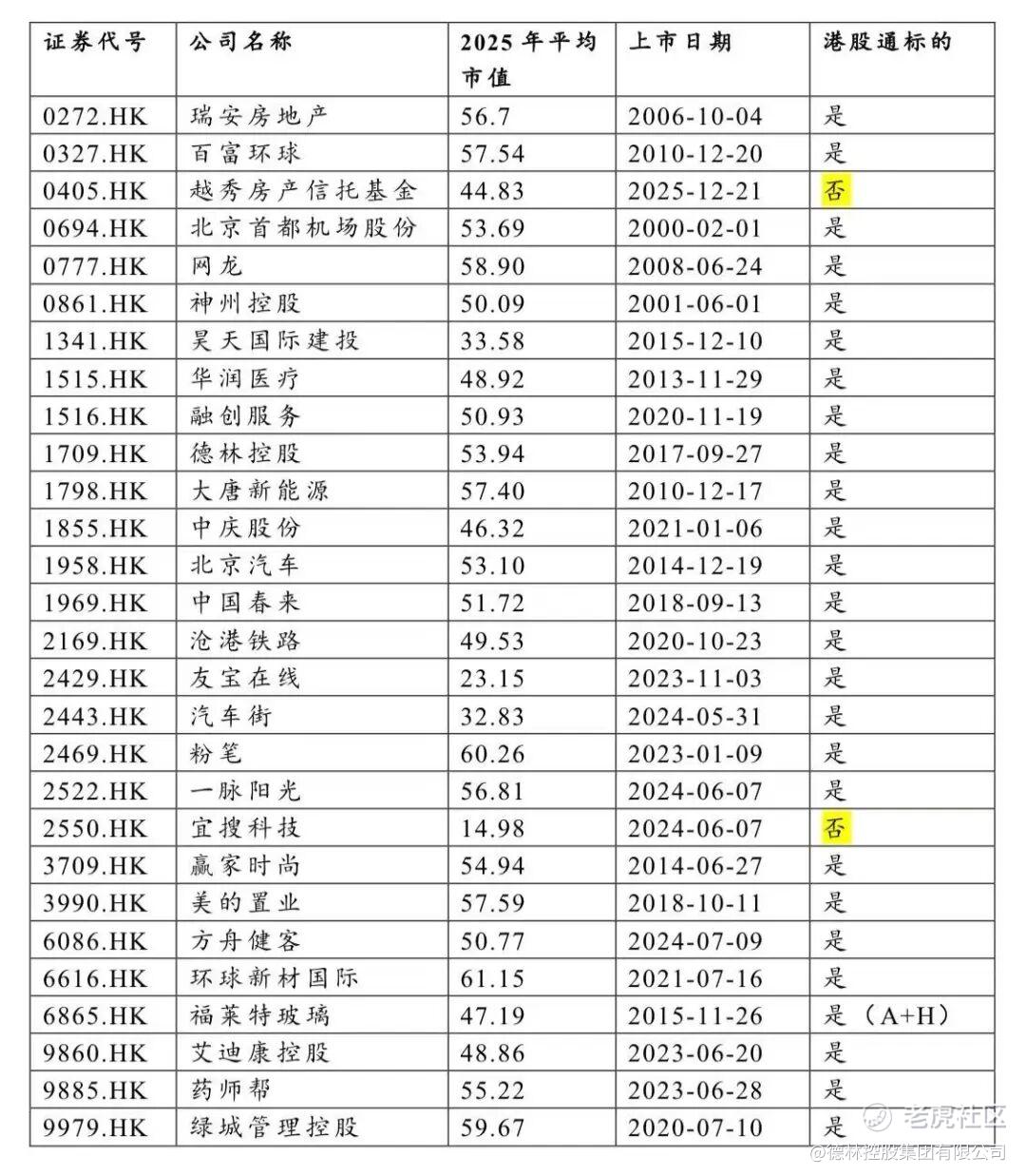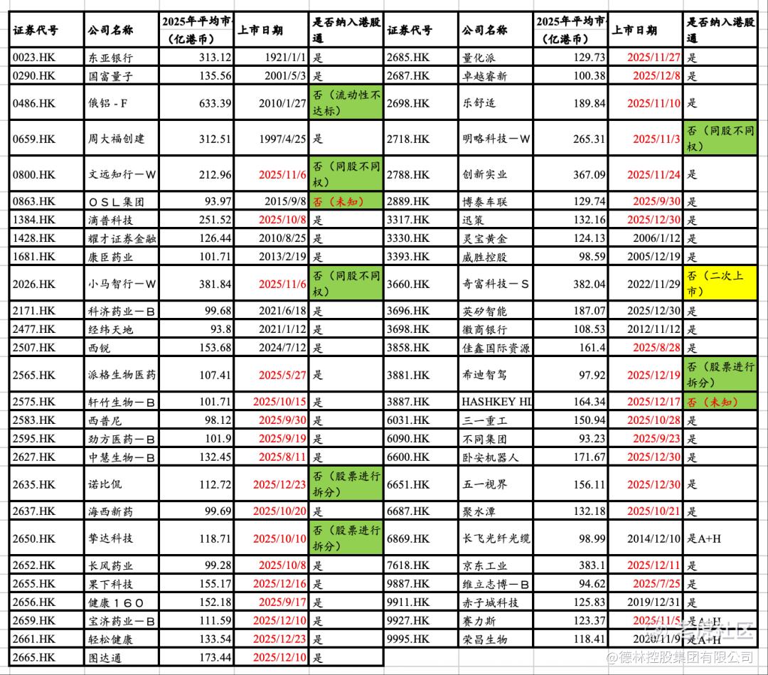 上述52家新加入恒生综合指数的公司里有35家都是2025年8月份以后上市的(标红部分),可以预见,未来的市值管理的压力会很大。预计在2026年年底的港股通检讨中就会有很多调整。