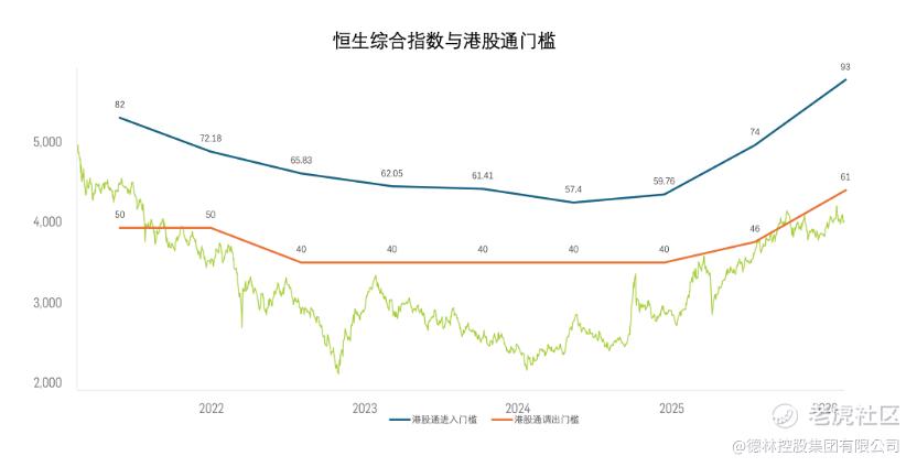 2025年8月22日恒生综合指数名单调整时,港股通入通门槛为74亿港币,剔除门槛为46亿港币。8月23日德林新经济研究院预计“2026年2月港股通调整时,恒生综合指数的剔除门槛会上调到58亿港币(即港股通调出门槛将同步上调至58亿港币),恒生综合指数的进入门槛会上调到90亿港币。”