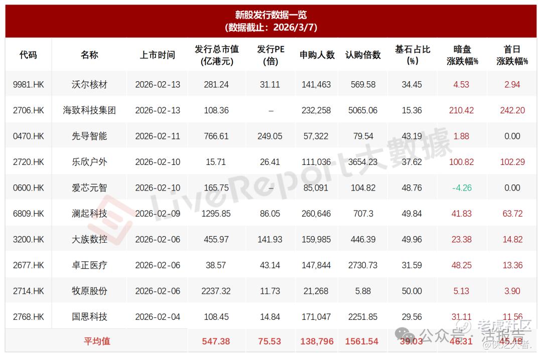 据**大数据,近10家上市新股平均发行市值为547.38亿,最大市值为牧原股份,最小市值为乐欣户外;平均发行PE为75.53倍,PE水平处于高位;平均申购人数为138,796人,平均认购倍数为1561.54倍;平均基石占比为46.31%,基石平均比例有所回升;