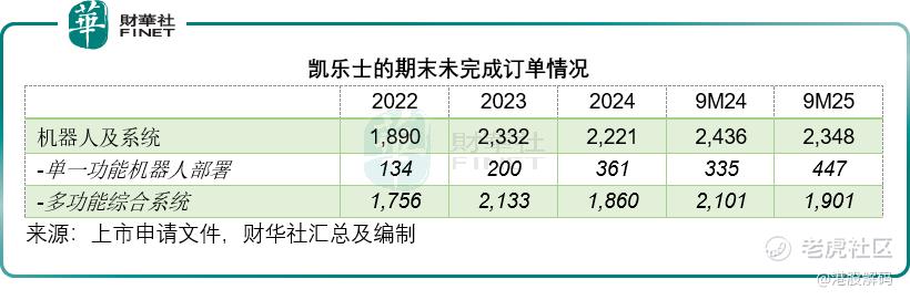 其财务数据显示,2025年前三季,机器人及系统的新订单金额为7.37亿元(单位人民币,下同),高于期内已确认收入6.10亿元,而2025年9月末的未完成订单仍高达23.48亿元,相当于其2025年前三季收入的3.85倍,其中大部分为多功能综合系统,大约占其未完成订单的79.21%。