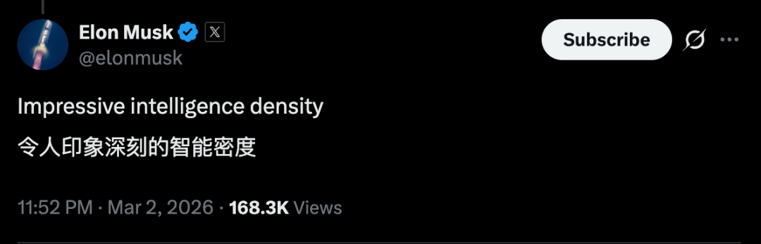 今年3月初,Qwen3.5系列的小尺寸模型开源发布后,马斯克迅速点赞,并表示:Impressive intelligence density(智能密度令人印象深刻)。