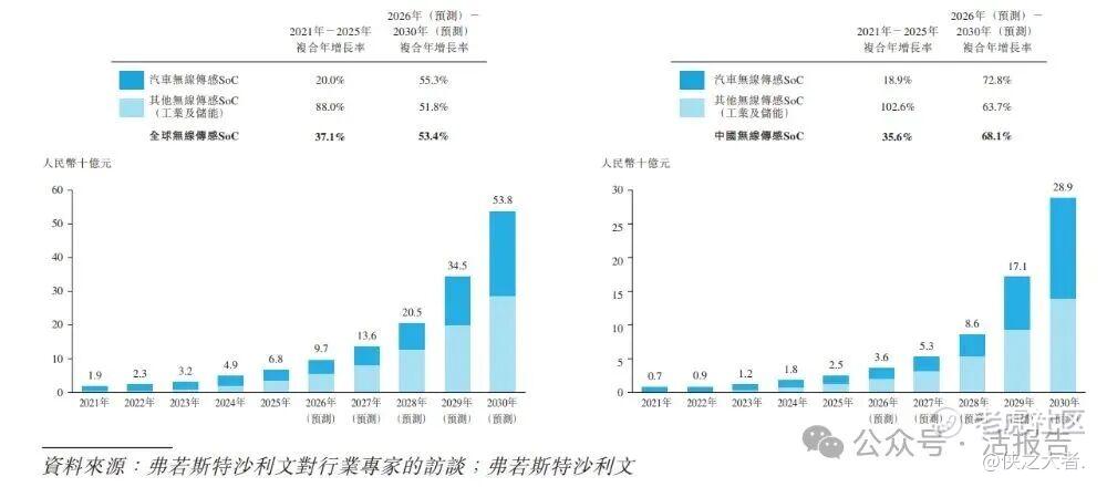 根据弗若斯特沙利文(Frost & Sullivan)的报告,按收入计,全球汽车无线传感SoC行业市场规模从2021年的人民币19亿元增长至2025年的人民币68亿元,复合年增长率为37.1%。预计至2030年,市场规模将达到人民币538亿元,2026年至2030年的复合年增长率为53.4%。