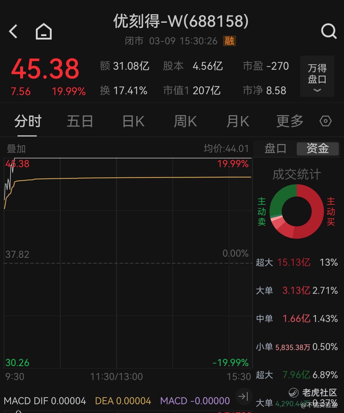 优刻得-W(688158)在3月9日早盘集合竞价后股价迅速拉升,于9:41左右触及20cm涨停,报45.38元,涨幅19.99%,成交额31.08亿元,换手率17.41%,总市值207.07亿元。