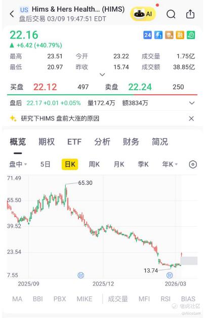 之前我没有怎么关注过这只股票 $Hims & Hers Health Inc.(HIMS)$,突然在异动页面看到涨幅惊人,被小小的惊了一下,赶紧来八卦一下这是一家什么神仙公司,他们的股票一夜之间可以涨这么猛。
