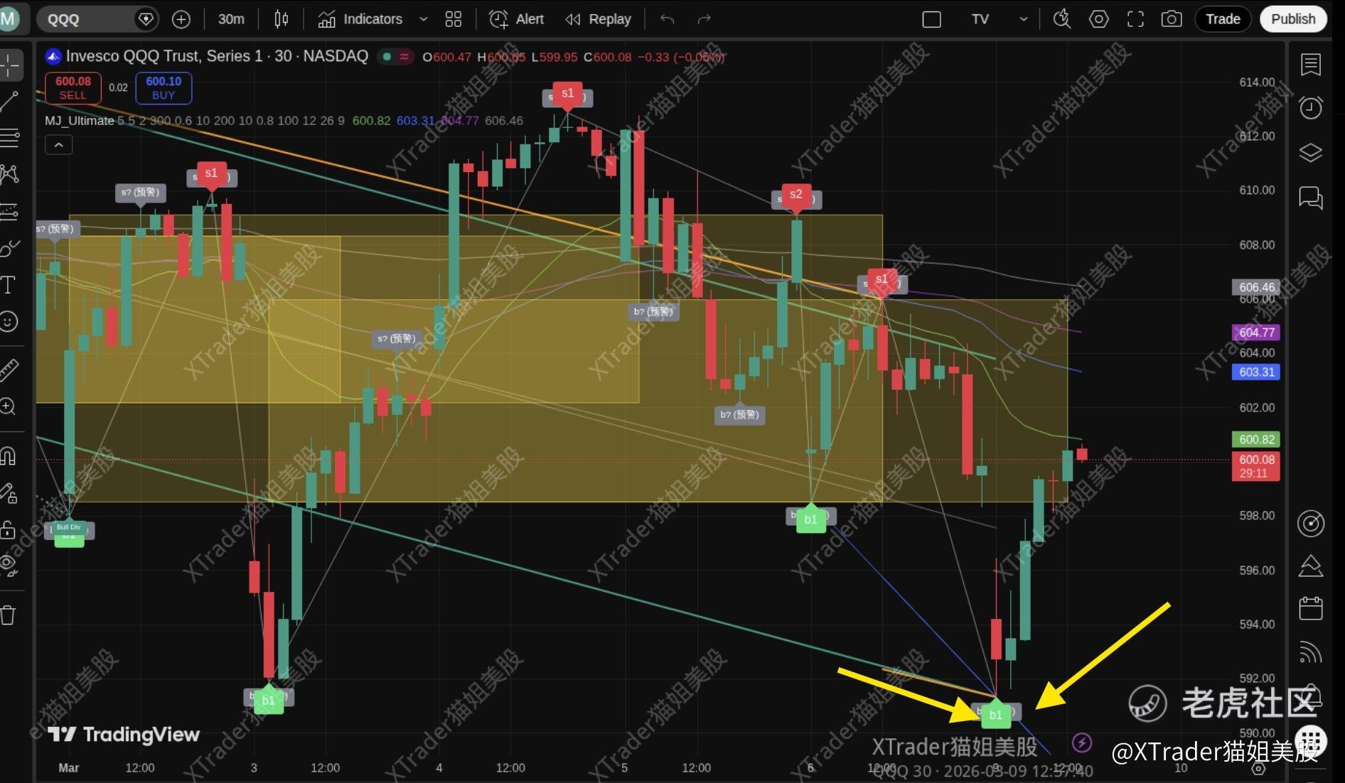 周一美股虽然大幅低开,但我们club的禅动买卖点指标开盘即触发买点预警(灰色B)之后确认(绿色B),和笨猫交易系统一致,两个底层算法不太一样,可以相互印证吧。