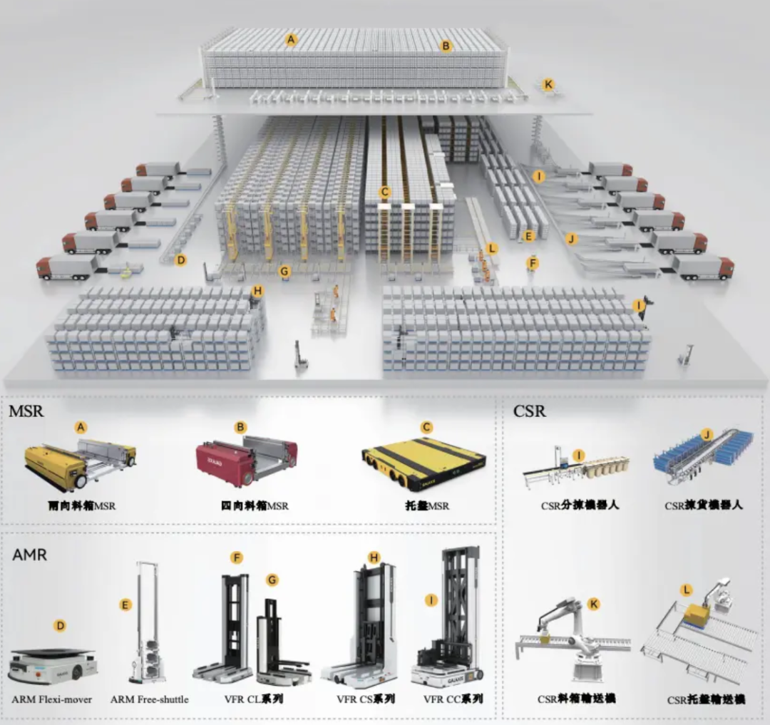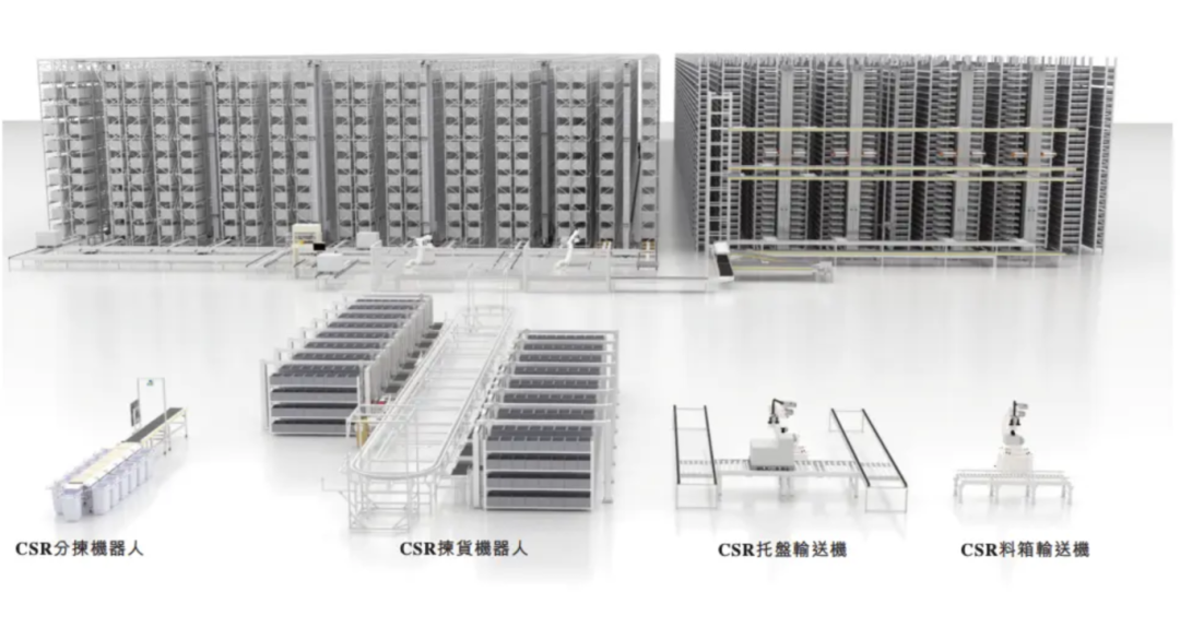 三是输送分拣机器人(CSR),可实现货物的快速分拣、精准输送,适配不同规格货物的处理需求。