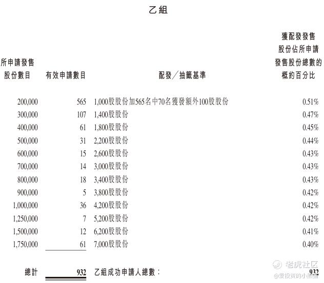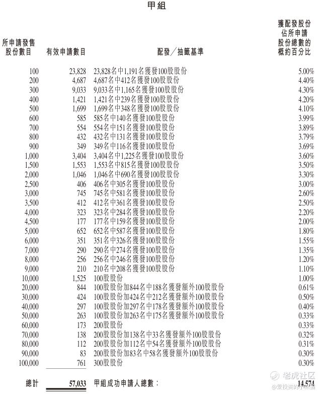 配售情况:57965人认购,这次公配174.12倍,由于机制B分配,无回拨比率,国配有4.50倍,一手中签率5.00%,认购100手稳中1手,同时乙组932人申购,其中顶头槌申购61张,获配率0.40%-0.51%。
