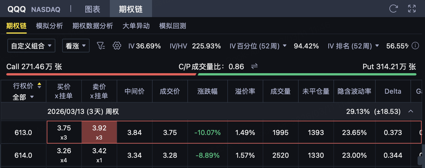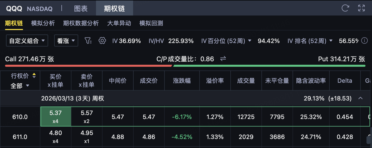 在这种背景下,若判断QQQ到期前难以有效突破610—613美元上方压力区间,则可考虑构建610/613的熊市看涨价差策略,在控制上行风险的同时,通过收取权利金争取收益。