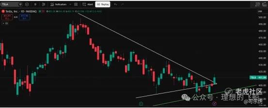 3、TSLA 今晚涨得不错,明天还在408之上可以试着介入,记得带止损5个点。