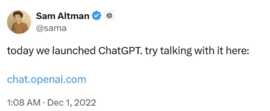 到了2022年,OpenAI已经开始训练GPT-4模型,团队希望在模型发布前开发一款聊天机器人,观测人类对AI的反馈,指引后续研究,并由创始人Sam Altman在推特上发布:
