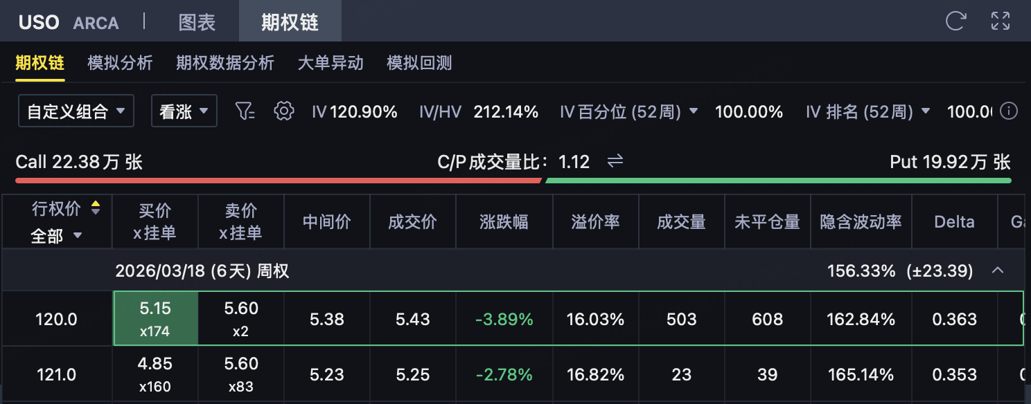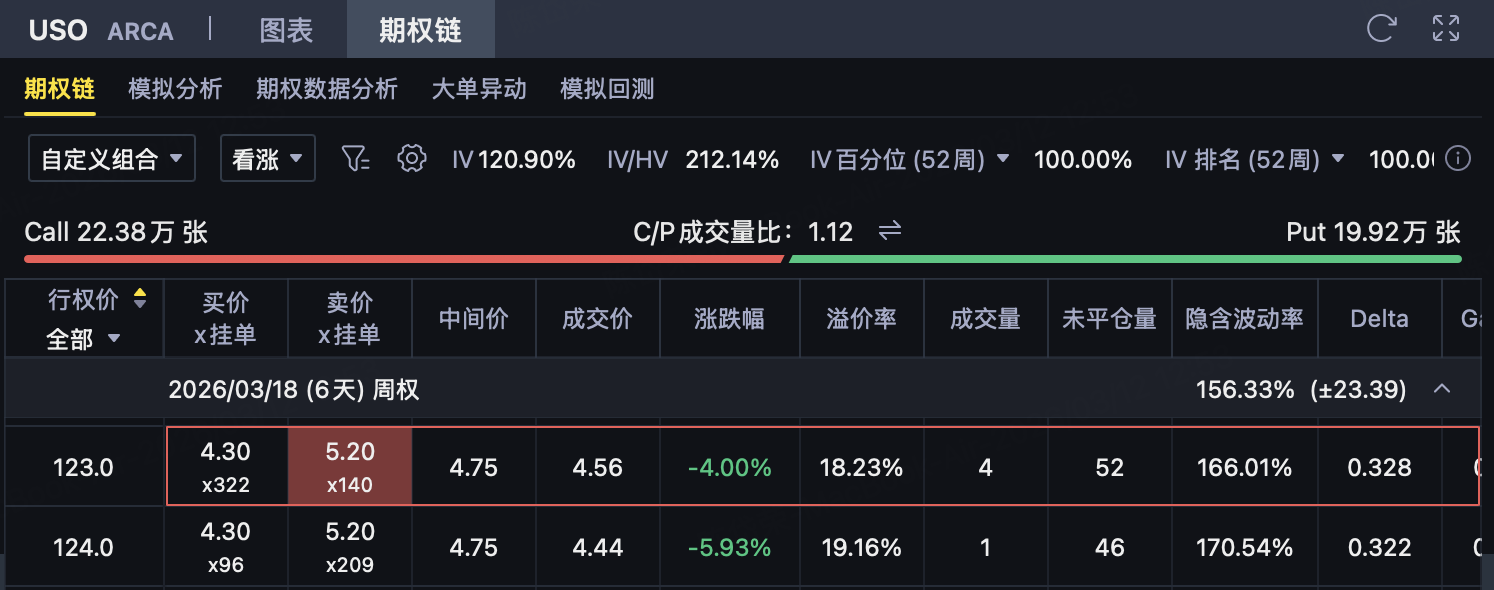从策略角度看,这种“强势但高波动、利多已经被快速计价”的环境,更适合用收权利金思路处理。如果判断USO到期前难以有效突破120—123美元上方压力区间,则可考虑构建120/123的熊市看涨价差策略,在控制上行风险的同时,通过收取权利金争取收益。
