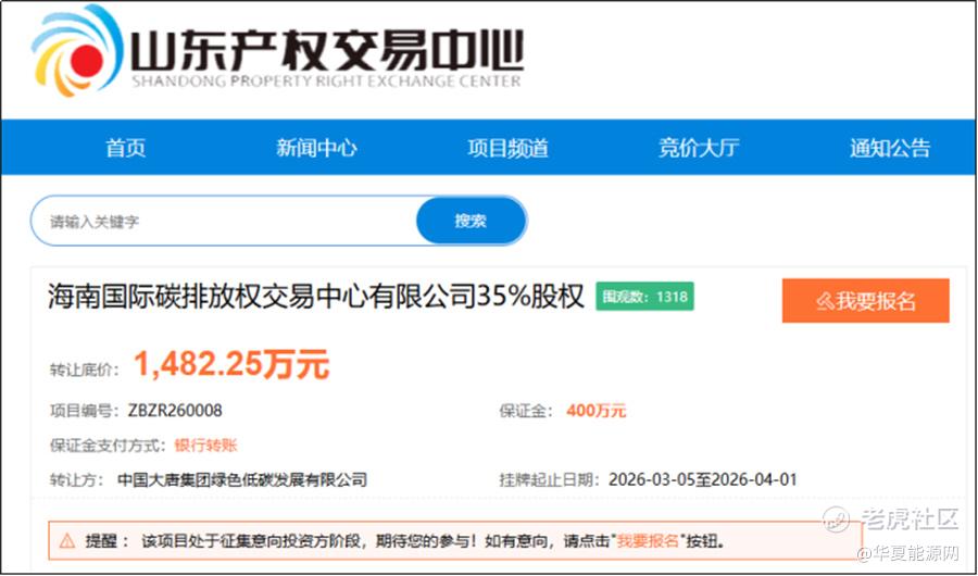 华夏能源网&华夏电力视界获悉,近日,山东产权交易中心发布信息显示,中国大唐集团绿色低碳发展有限公司(以下简称“大唐低碳公司”)已于3月5日正式挂牌,拟出售其持有的海南国际碳排放权交易中心有限公司(以下简称“海碳中心”)35%股权,转让底价为1482.25万元,挂牌期至4月1日。