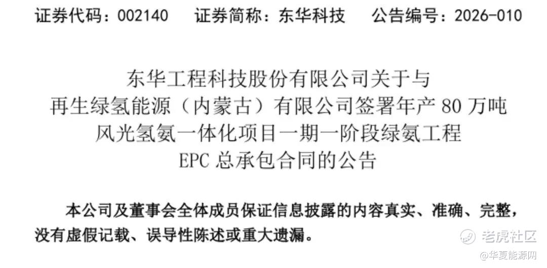 华夏能源网&华夏氢能获悉,近日,东华工程科技股份有限公司(以下简称“东华科技”)发布《关于与再生绿氢能源(内蒙古)有限公司(以下简称“再生绿氢公司”)签署年产80万吨风光氢氨一体化项目一期一阶段绿氨工程EPC总承包合同的公告》。