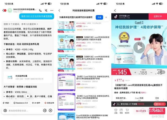 背后依托抖音商城生态的豆包则相对顺畅。以用户提出“推荐300元左右适合秋冬的保湿面霜”这一场景为例,豆包直接在对话界面展示商品卡片,用户点击商品卡片后可跳转抖音商城完成购买。最新消息称,豆包应用内直接下单支付的功能目前已经处于内测阶段。