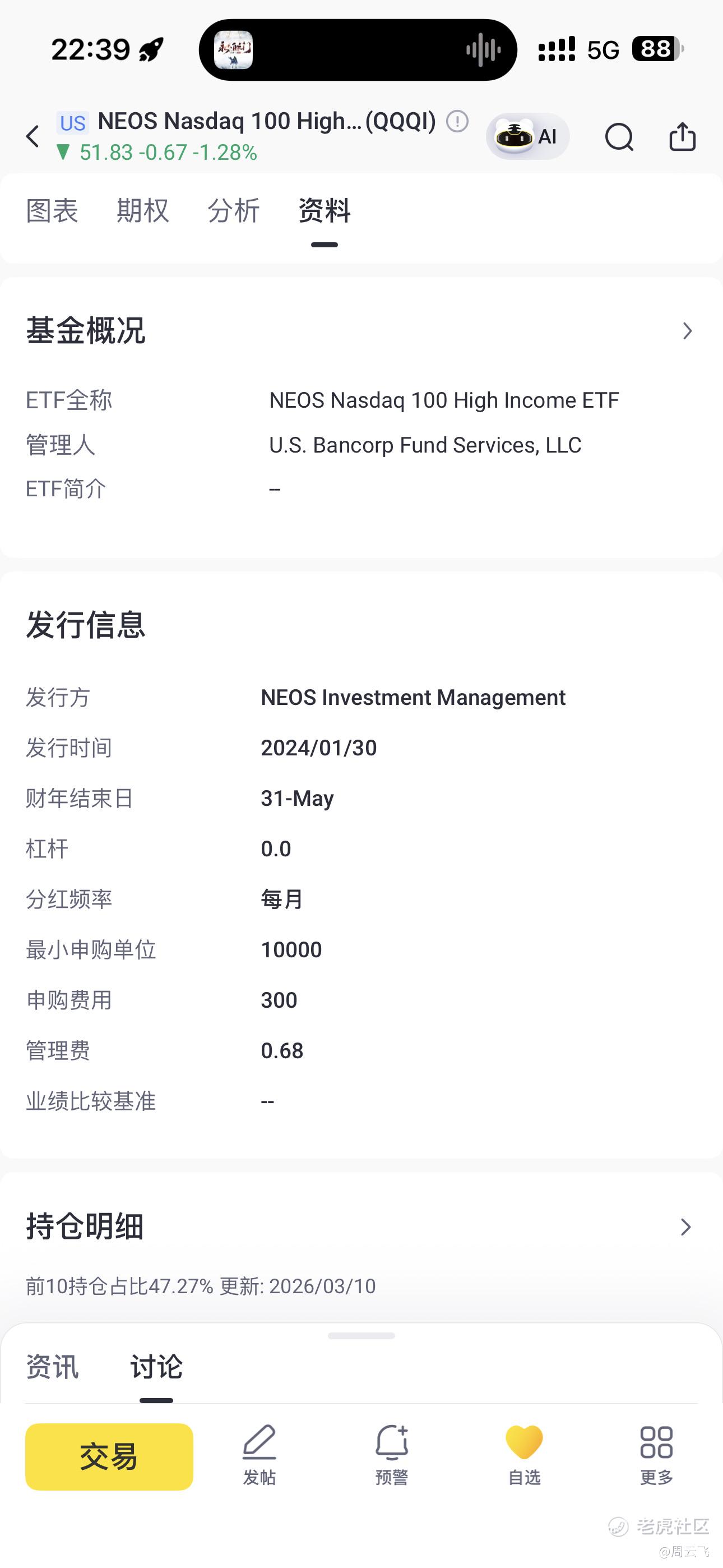 $NEOS Nasdaq 100 High Income ETF(QQQI)$ 麻烦问下,这个最小申购金额10000是什么意思?我发现我可以申购4000,还有这个申购费用300是嘛意思?不是费用是0.68吗?