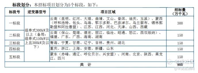招标公告显示,标段一采购容量3GW;标段二、三、四、五采购容量均为1.5GW,总规模9GW,型号均为组串式300kW及以上型号(备用:组串式150kW以上且300kW及以下型号)。