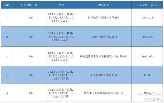 本次招标共分为5个标段,每个标段的中标企业分别为神州数码(深圳)有限公司、上能电气股份有限公司(简称“上能电气”,SZ:300827)、株洲变流技术国家工程研究中心有限公司、阳光电源股份有限公司(简称“阳光电源”,SZ:300274)、特变电工新疆新能源股份有限公司。