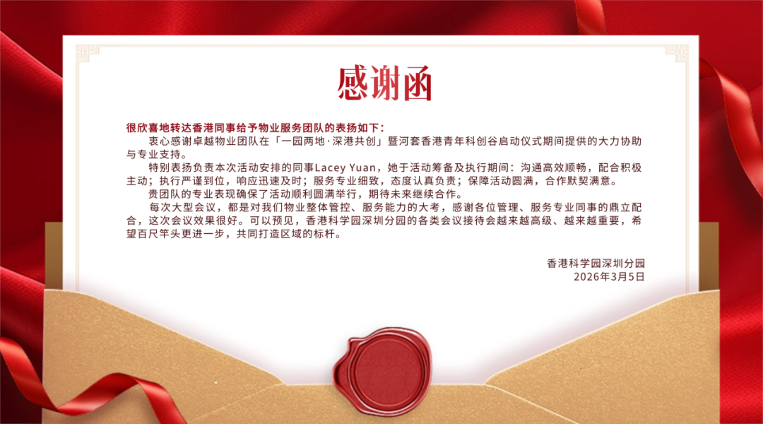 3月2日,由香港科技园公司与河套深港科技创新合作区深圳园区发展署联合主办的“一园两地、深港共创”——暨河套香港青年科创谷启动仪式在香港科学园深圳分园举行。卓越商企服务河套团队作为香港科学园深圳分园物业服务提供商,圆满承接此次活动的全流程保障工作,以专业高效的执行力赢得客户高度认可,为公司品牌在深港合作领域再添口碑。
