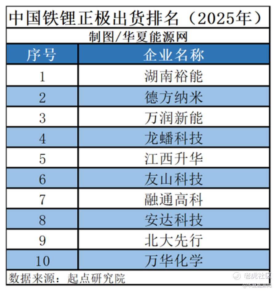 不久前,起点研究院SPIR发布的《2026全球锂电行业白皮书报告》显示,万华化学已经位列2025年中国锂电磷酸铁锂正极材料出货十强。
